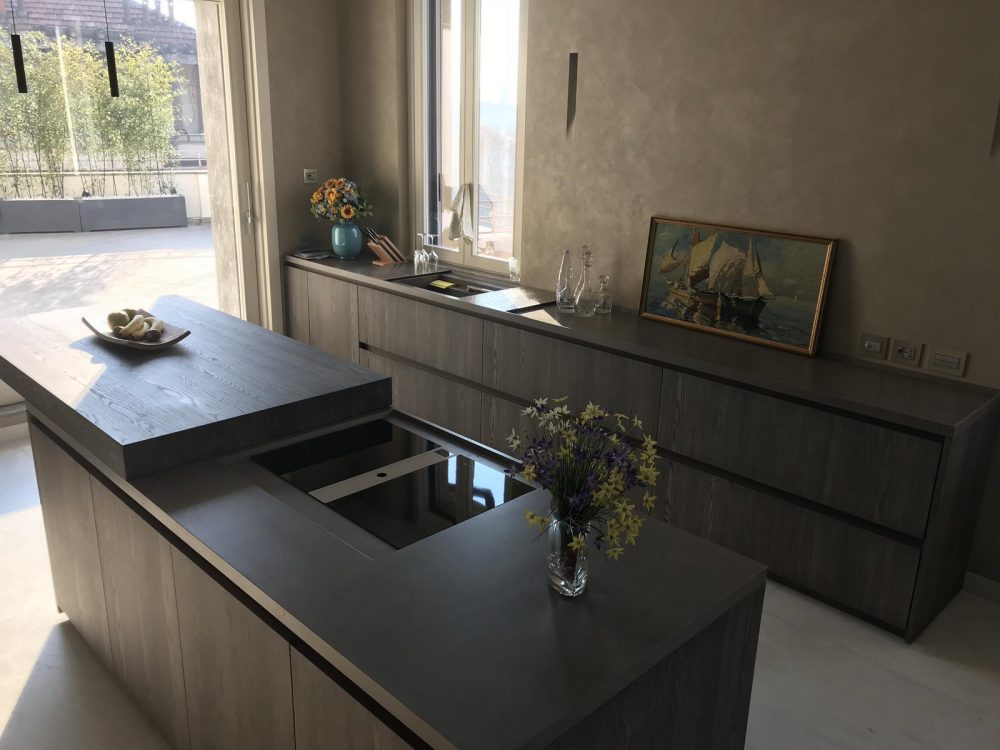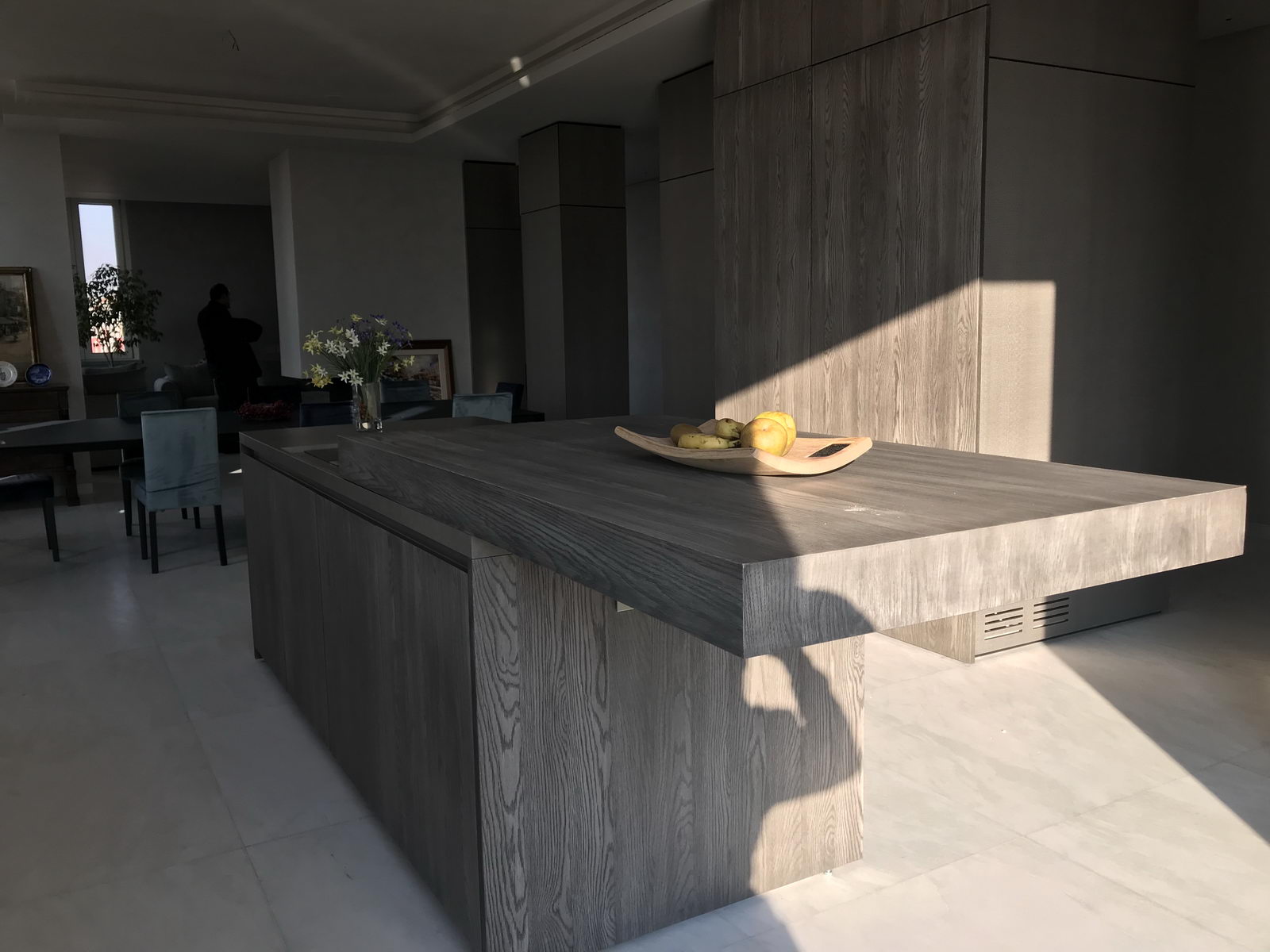 Bluna model columns in heat-treated oak, matt lacquered bases, stone brown stoneware top, heat-treated oak snack top.